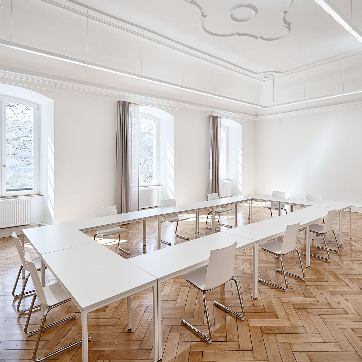 Versatile combinable and applicable: fox is also available as stackable cantilever chair with plastic seating shell. The C-shape frame is open in the front.
