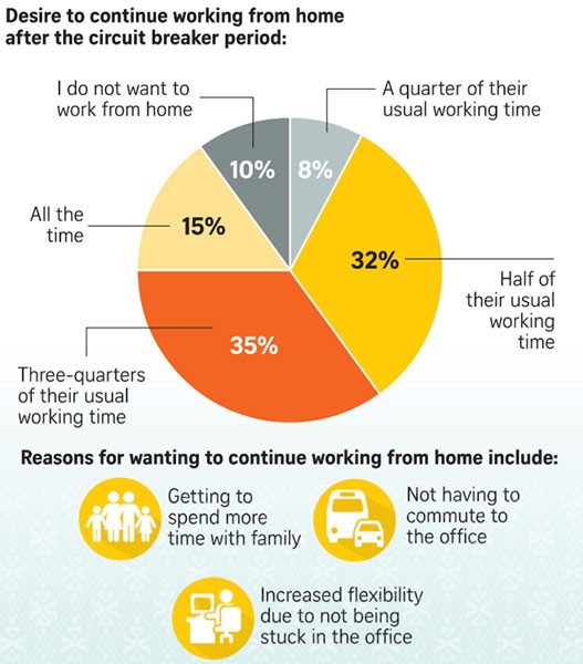 Amid all the challenges faced during the Circuit Breaker, it seems that we’ve gotten used to homeworking—and actually like it. People have found that working from home has its perks, like zero commuting time, spending more time with family, flexibility, a greater control over work-life balance, etc. A Straits Times article shared a graphic to this effect (shown below). The information references a survey conducted by EngageRocket, in conjunction with the Singapore Human Resources Institute and the Institute for Human Resources Professionals, which showed that 9 out of 10 Singaporeans still want to continue working from home in some capacity, even when the pandemic is over.