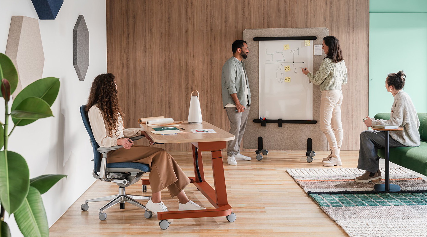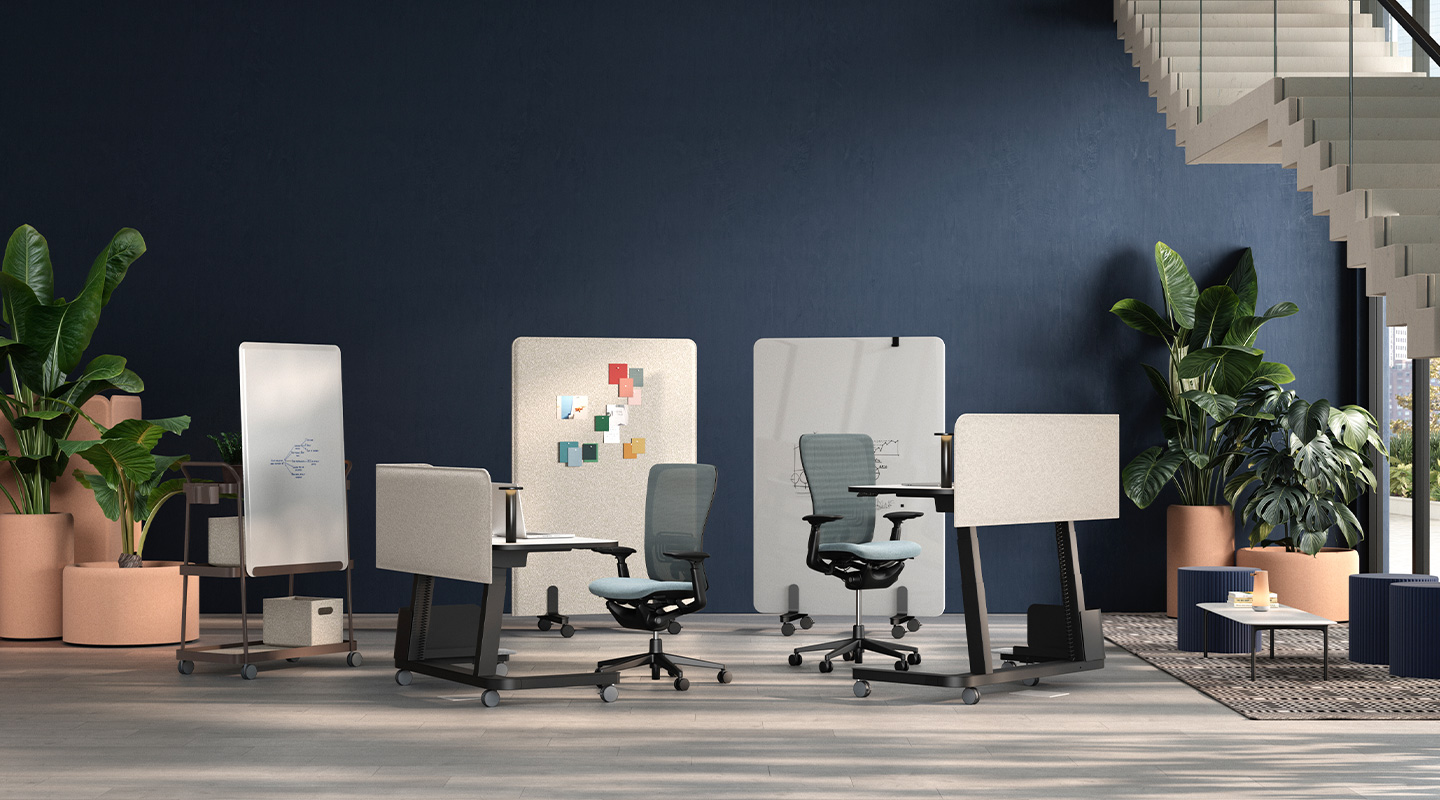 Haworth Collaborate Screens are available in fabric or markerboard. Both the fabric and the markerboard options are on four-way-pivot castors, making them easy to move and rearrange. You can even configure them at a ninety-degree angle to create a private meeting corner – your own little brainstorming sanctuary.
