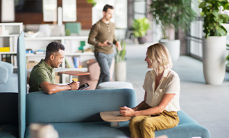 - Verankern Sie große visuelle Flächen – Bildschirme an Arbeitsplätzen, Stühle & Sitzmöbel für die Zusammenarbeit, Wandpaneele – in warmen Off-White-Tönen, um visuelle Unruhe zu reduzieren.