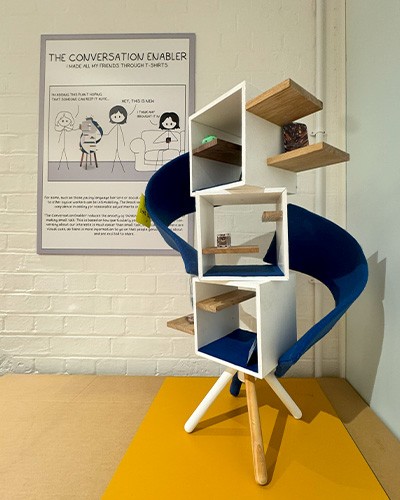 Victor described the Conversation Enabler as a sculptural ‘open library’. Neurodivergent people are ‘social as much as anyone else,’ Victor says. The piece aims to ease conversational barriers to entry that can otherwise scuttle socialising.