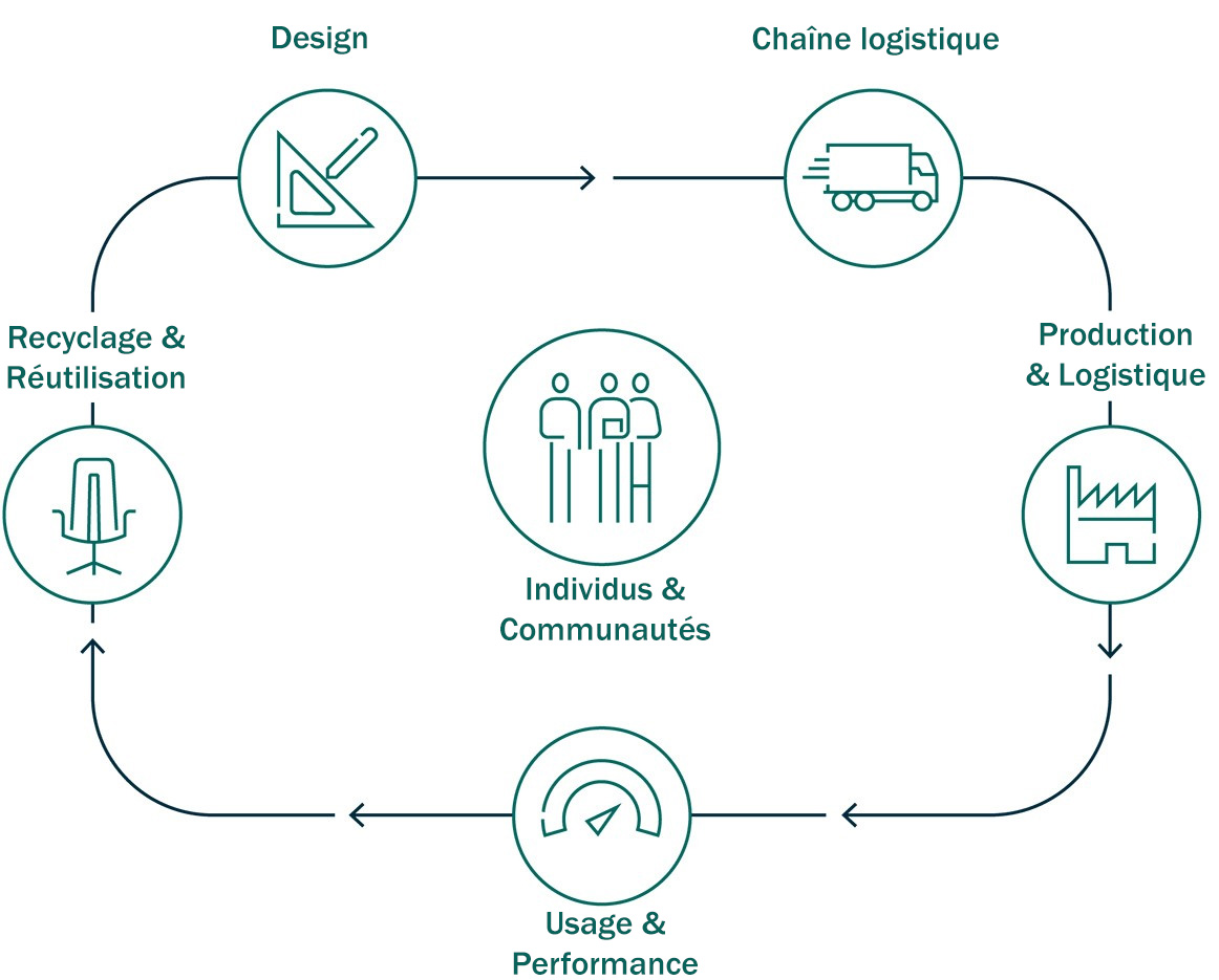 Le fait de devenir une société durable implique l’engagement de l’ensemble de nos collaborateurs, fournisseurs et partenaires. Pour mettre en œuvre notre stratégie, nous utilisons un cycle de valeur, qui nous sert de cadre pour orienter nos actions.