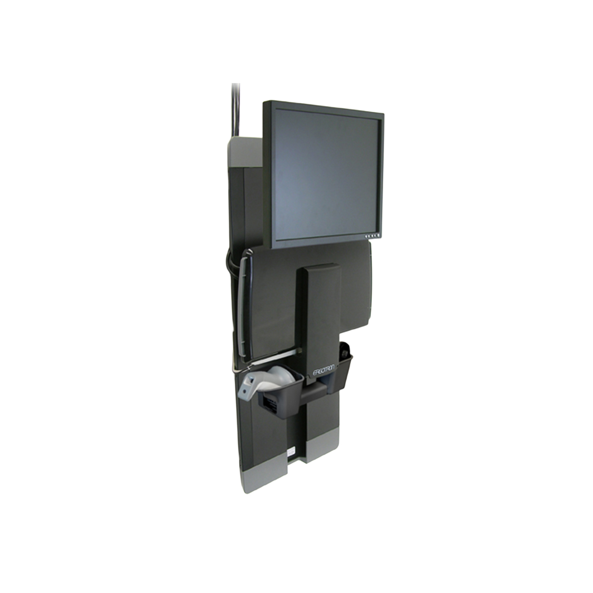 In high-traffic areas where space is limited, height-adjustable wall-mounted workstations offer space-saving, stowable solutions that adapt to each caregiver for computer use, writing, and other tasks while sitting or standing.
