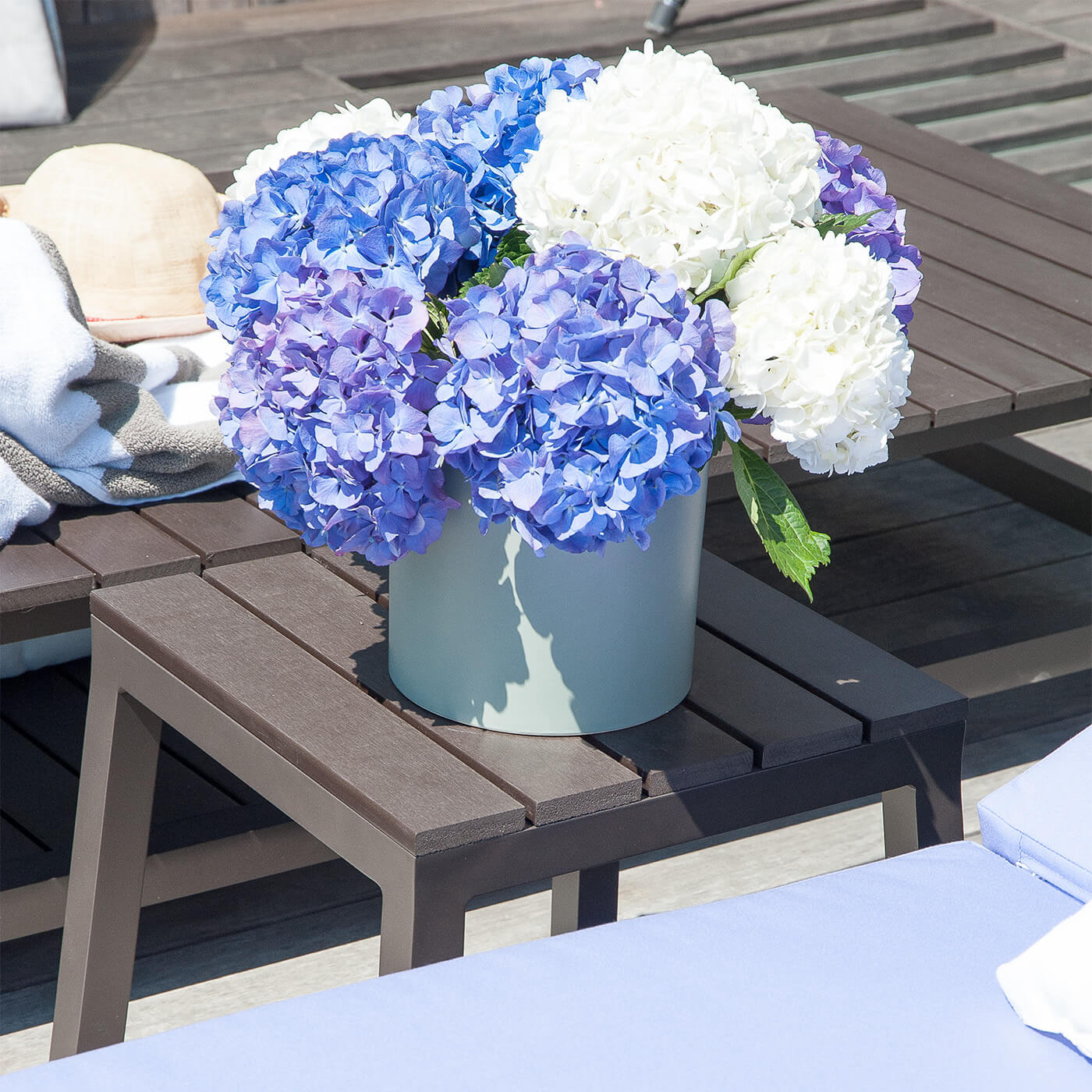 Contemporary, slatted tables for indoors and outdoors