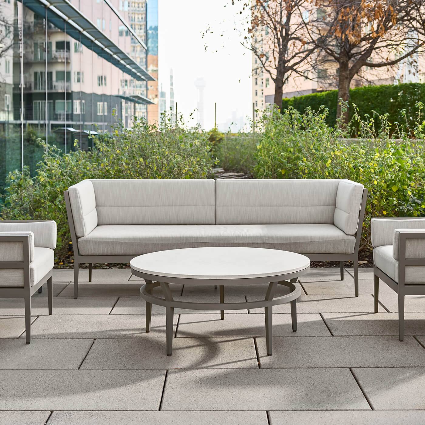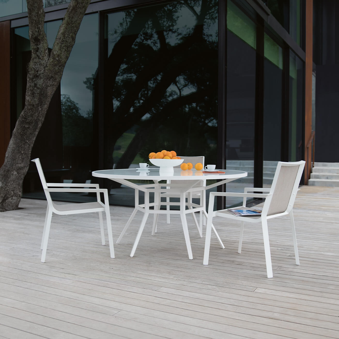 A refined, architectural table designed for outdoor use