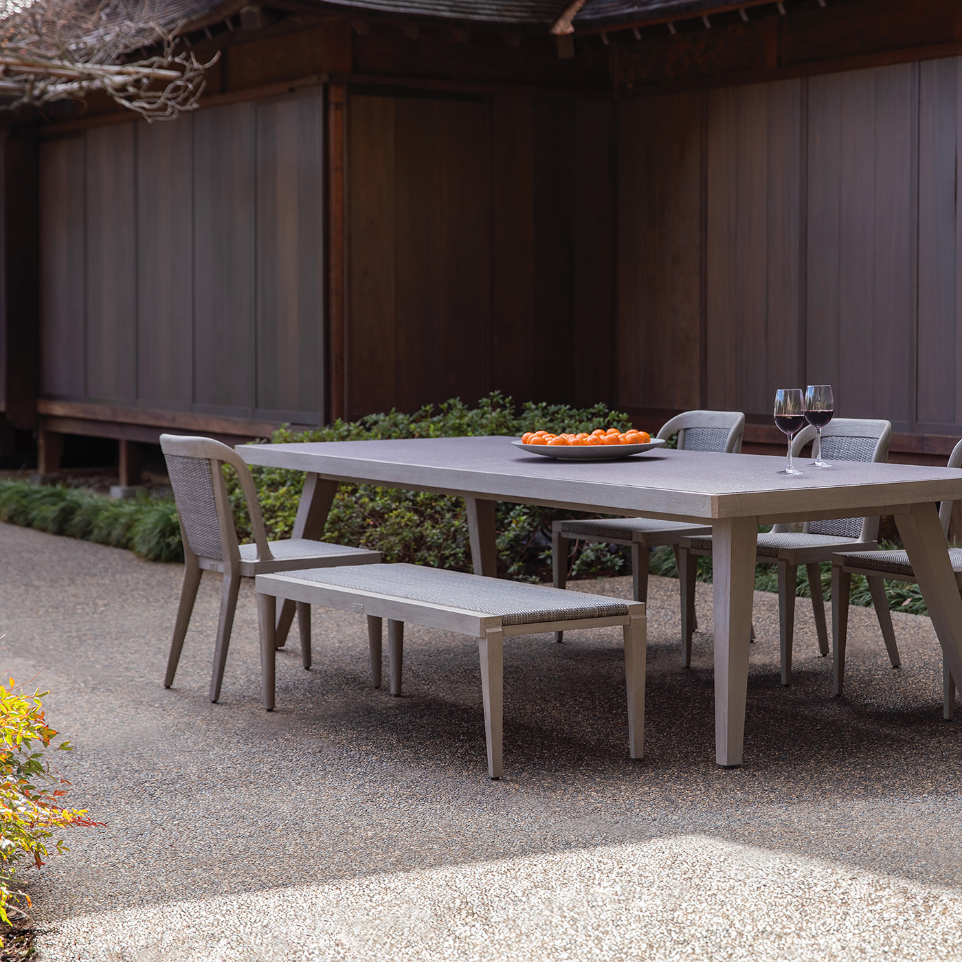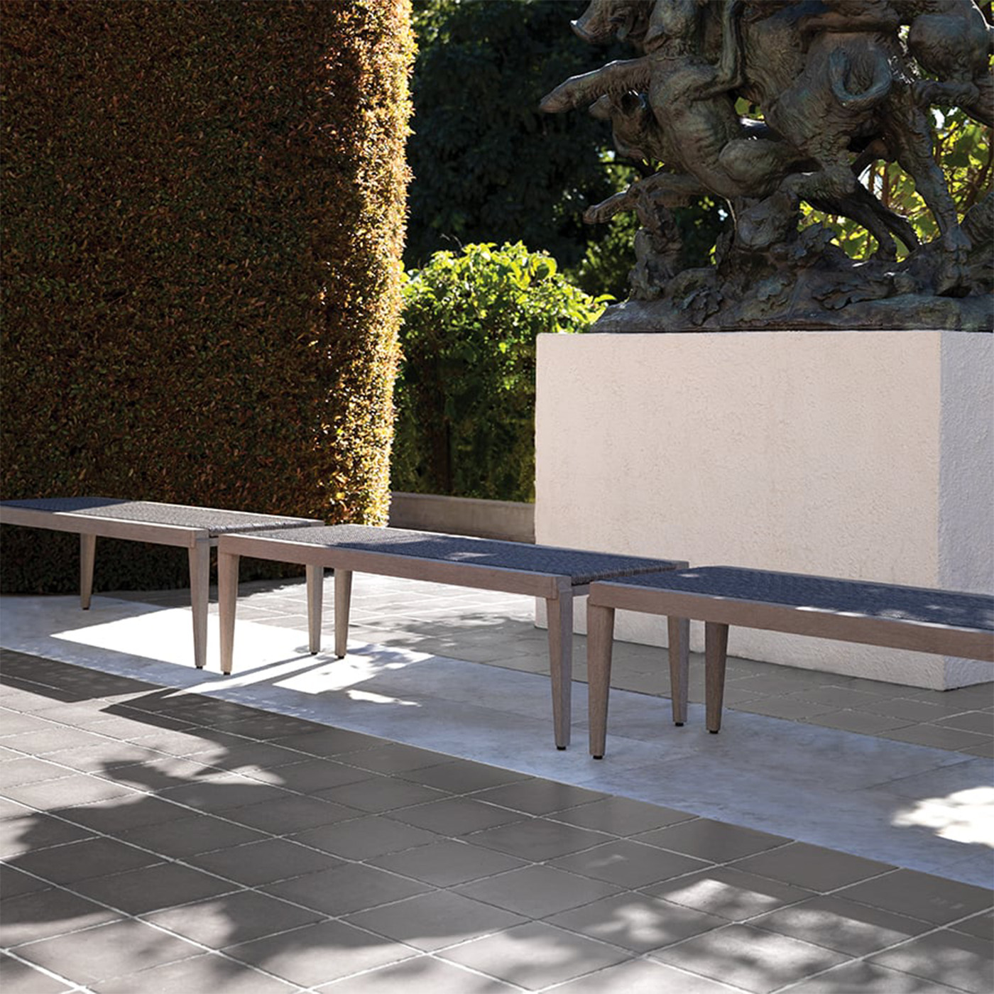 Rock Garden seating and tables offer eye-catching refinement for a variety of settings, both indoors and outdoors. The Rock Garden bench combines sleek lines and richly textured, weather-resistant materials. Sturdy and durable, the bench features a driftwood-painted teak frame and handwoven seat. The bench pairs with Rock Garden tables, sofas, chairs, and stools.