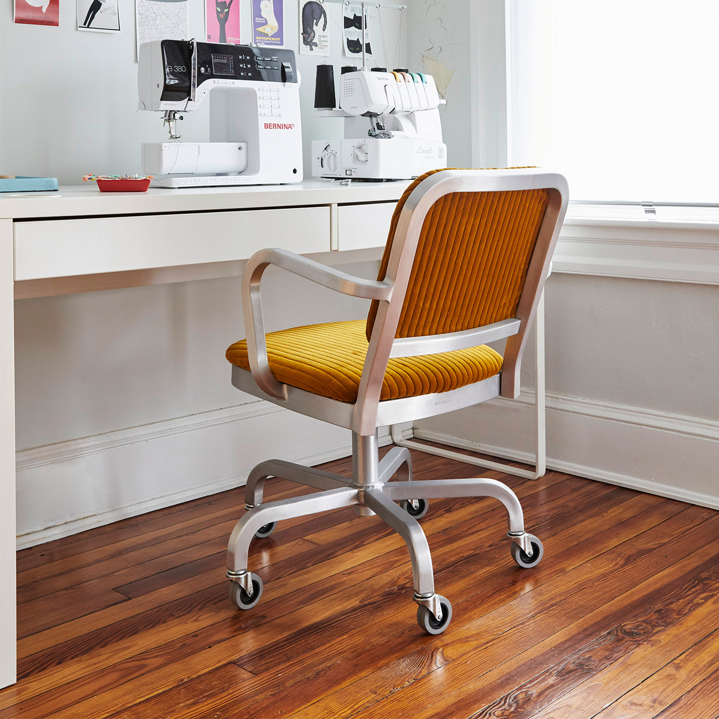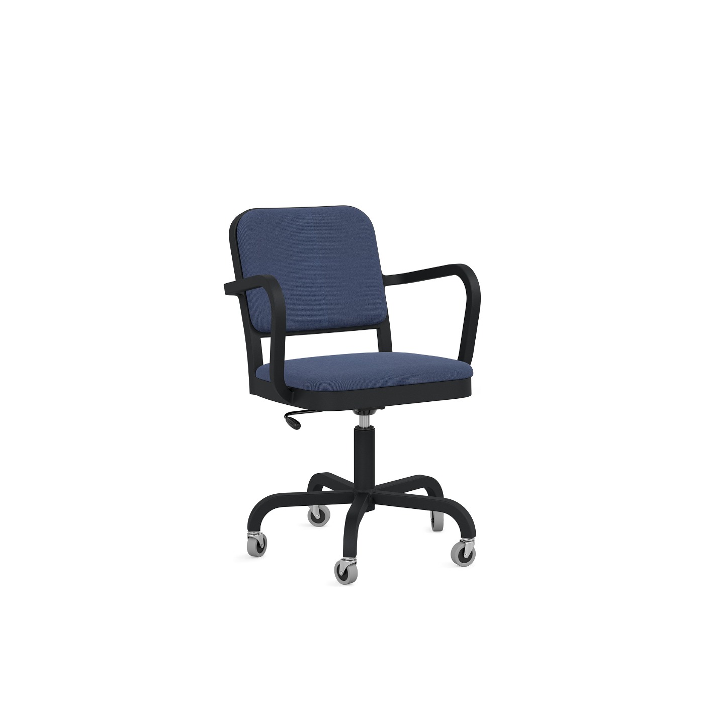 A companion to the Navy Officer side chair, the Navy Officer conference chair evokes the iconic design of the Navy seating family. Similar to the side chair, this mobile version is upholstered for an extra level of cushioned comfort and durability. It is equipped with a swivel base, back tension adjustment, and height adjustment.