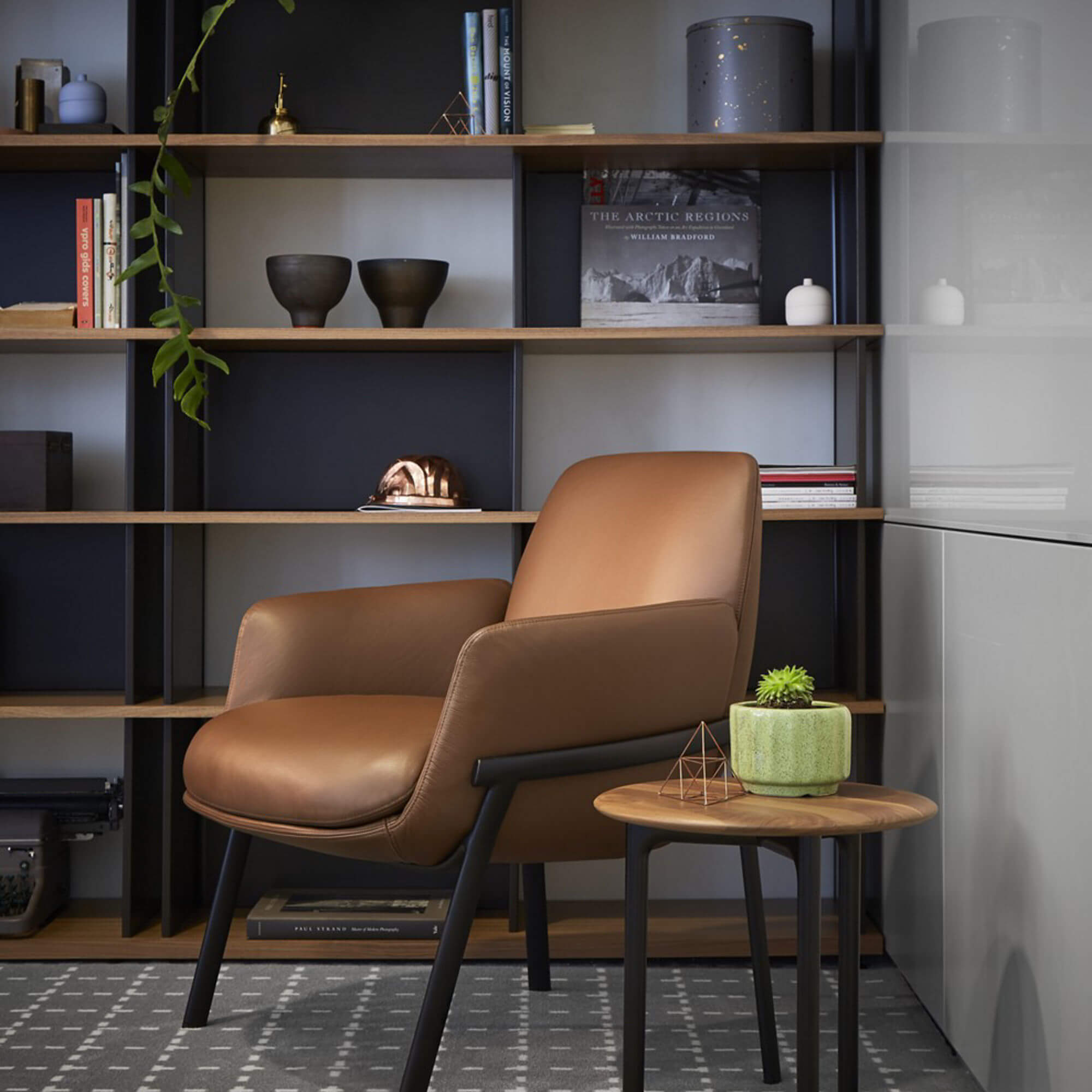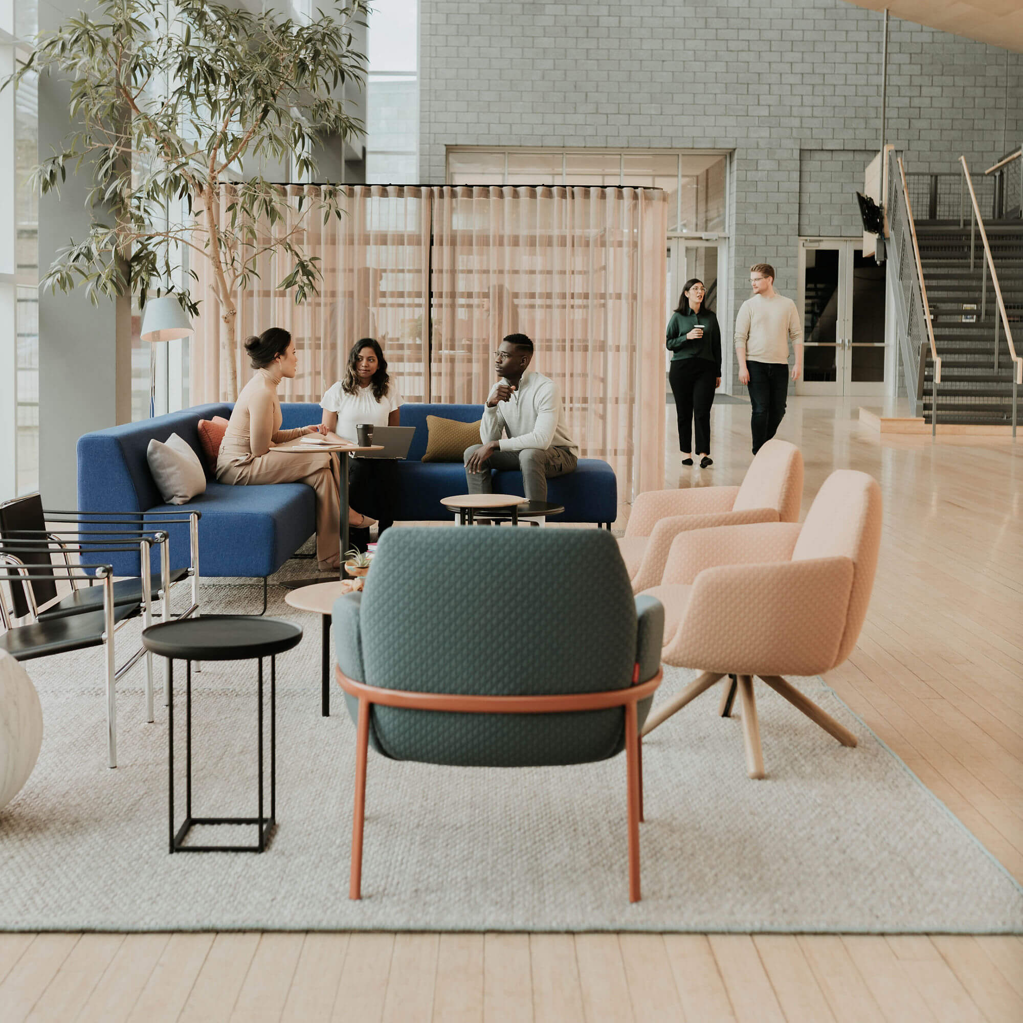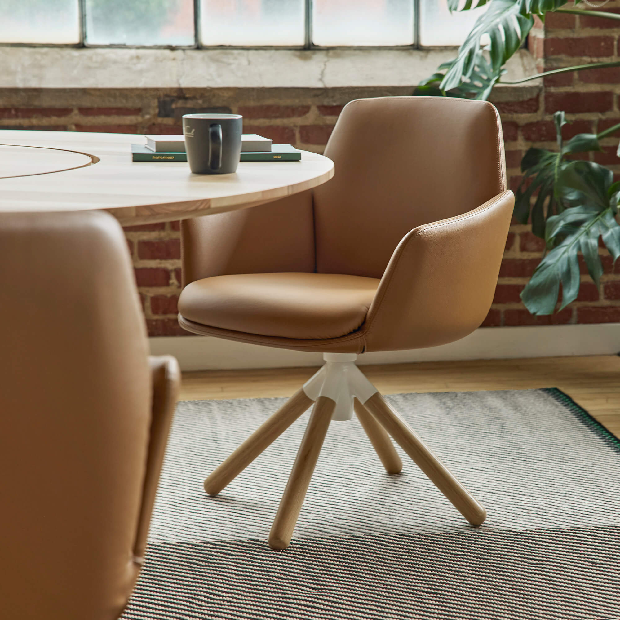 A warm, inviting office lounge chair with a gently flexing back