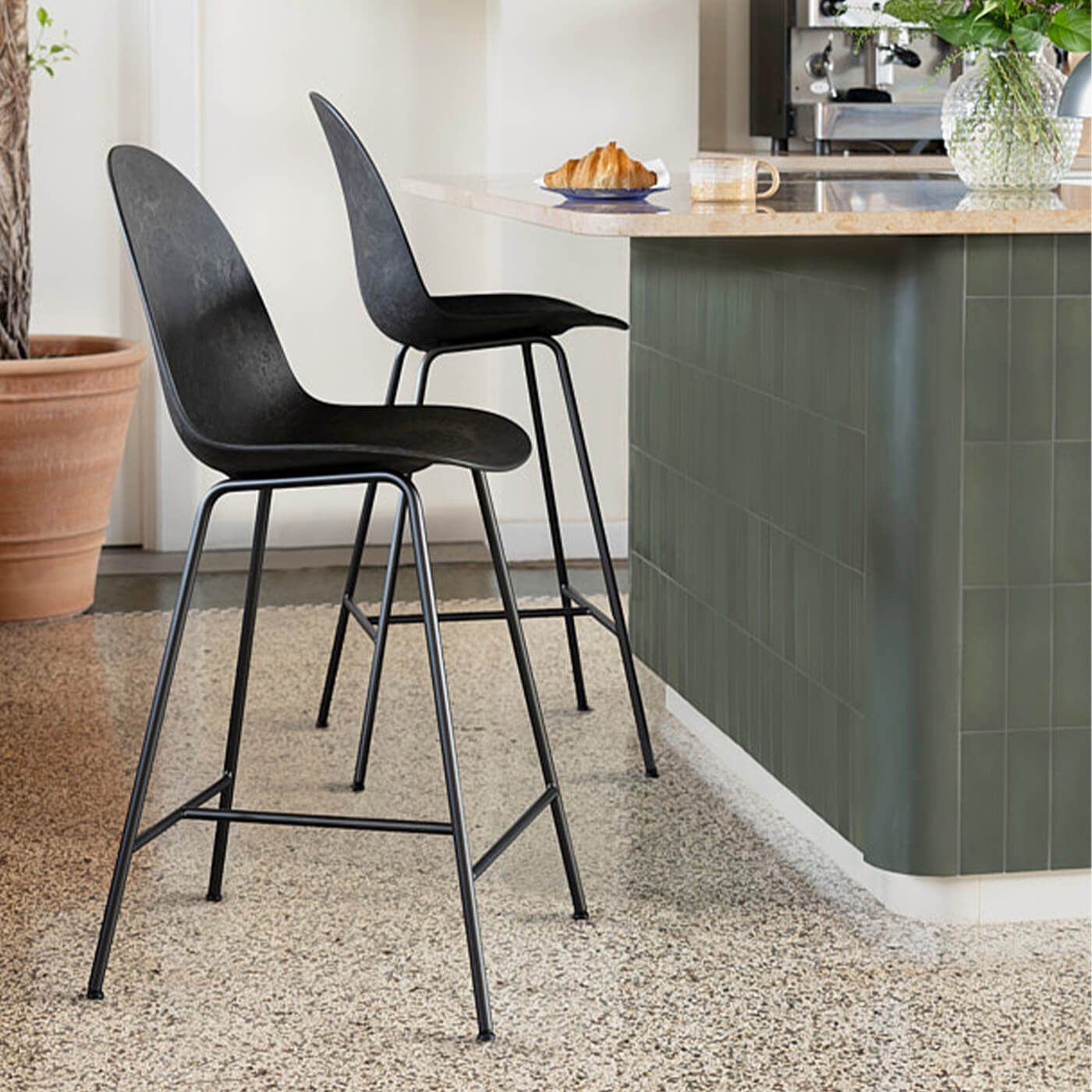 The Eternity stool showcases a bold silhouette molded from Matek® material—a durable blend of coffee shells, wood fibers, and recycled plastic. Its contoured shell delivers comfort with an industrial edge that's well-suited for hospitality, community, and workplace spaces. The Eternity collection also includes a side chair and conference chair.