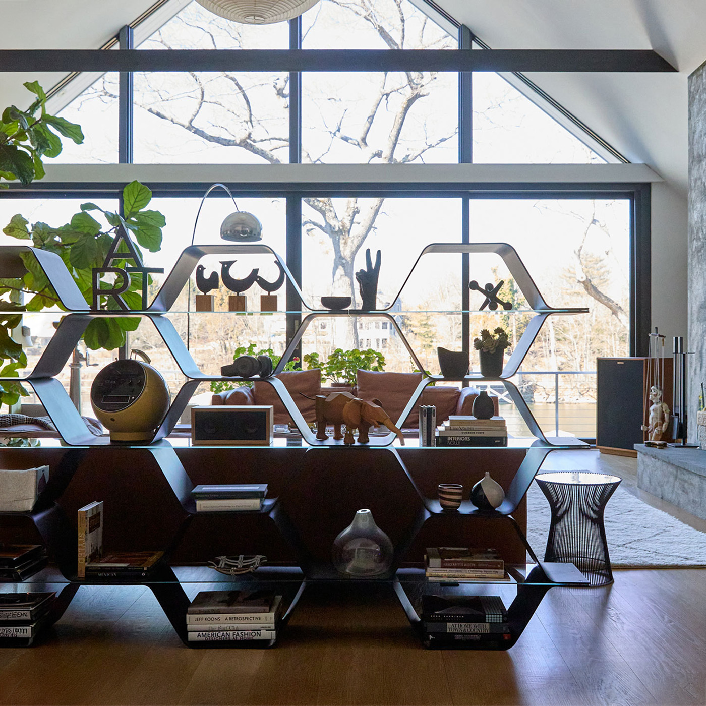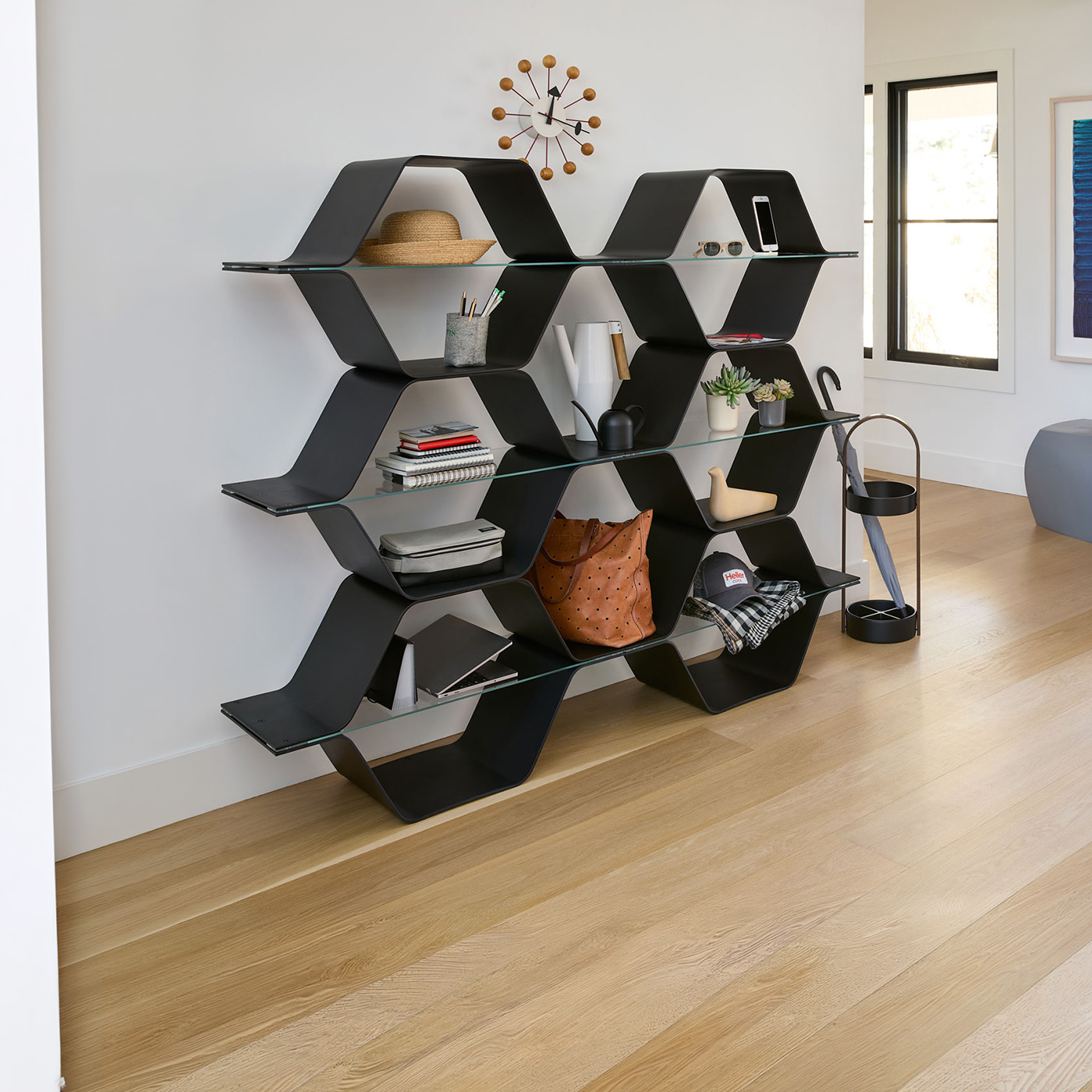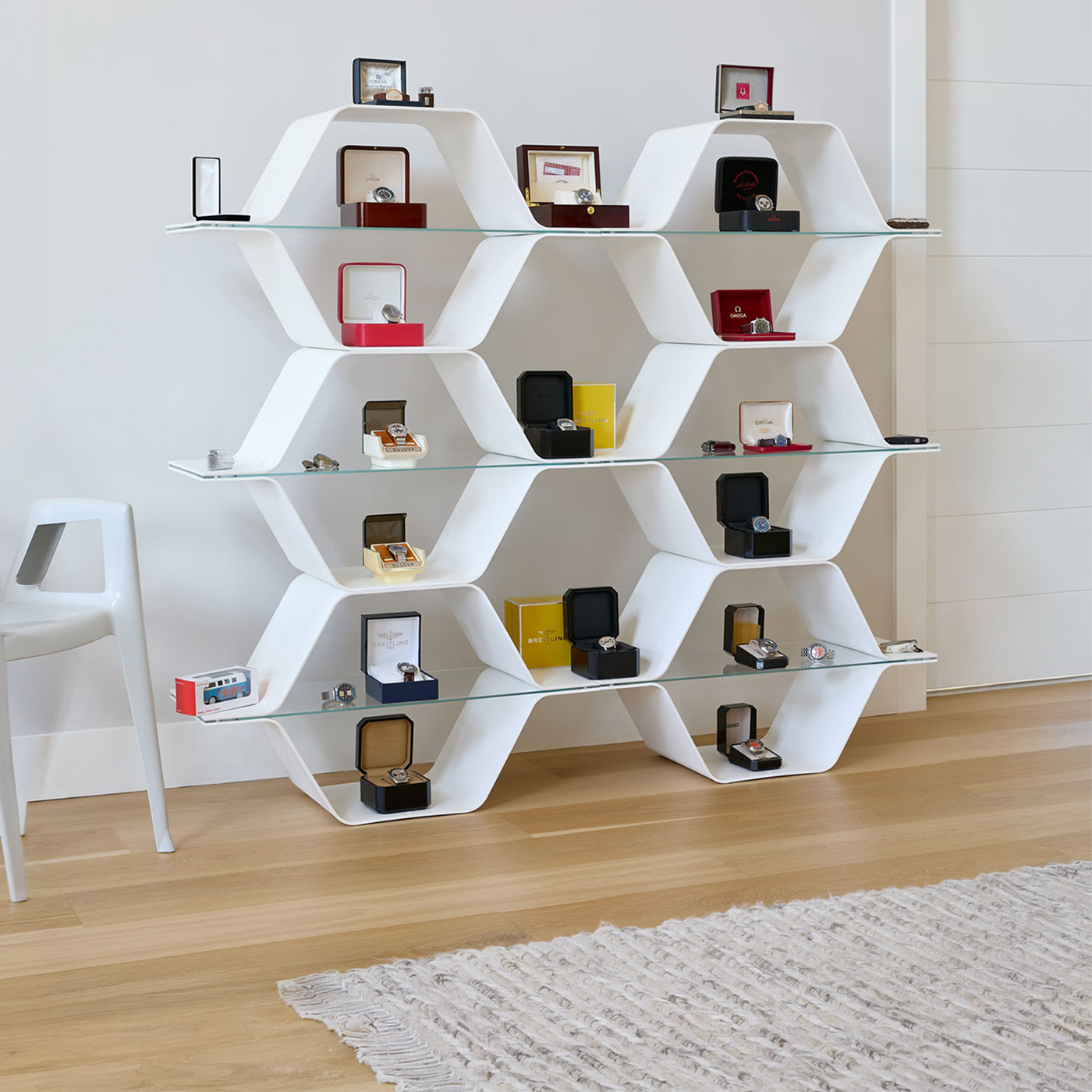 Originally created in 1970, Bill Curry’s honeycomb design returns, reimagined as a modular system made from sustainable plastic. Add cells and create configurations to suit the needs of your space. Store items or display décor on its tempered glass shelves. With a unique, Space Age design, Honeycomb is a distinctive presence.