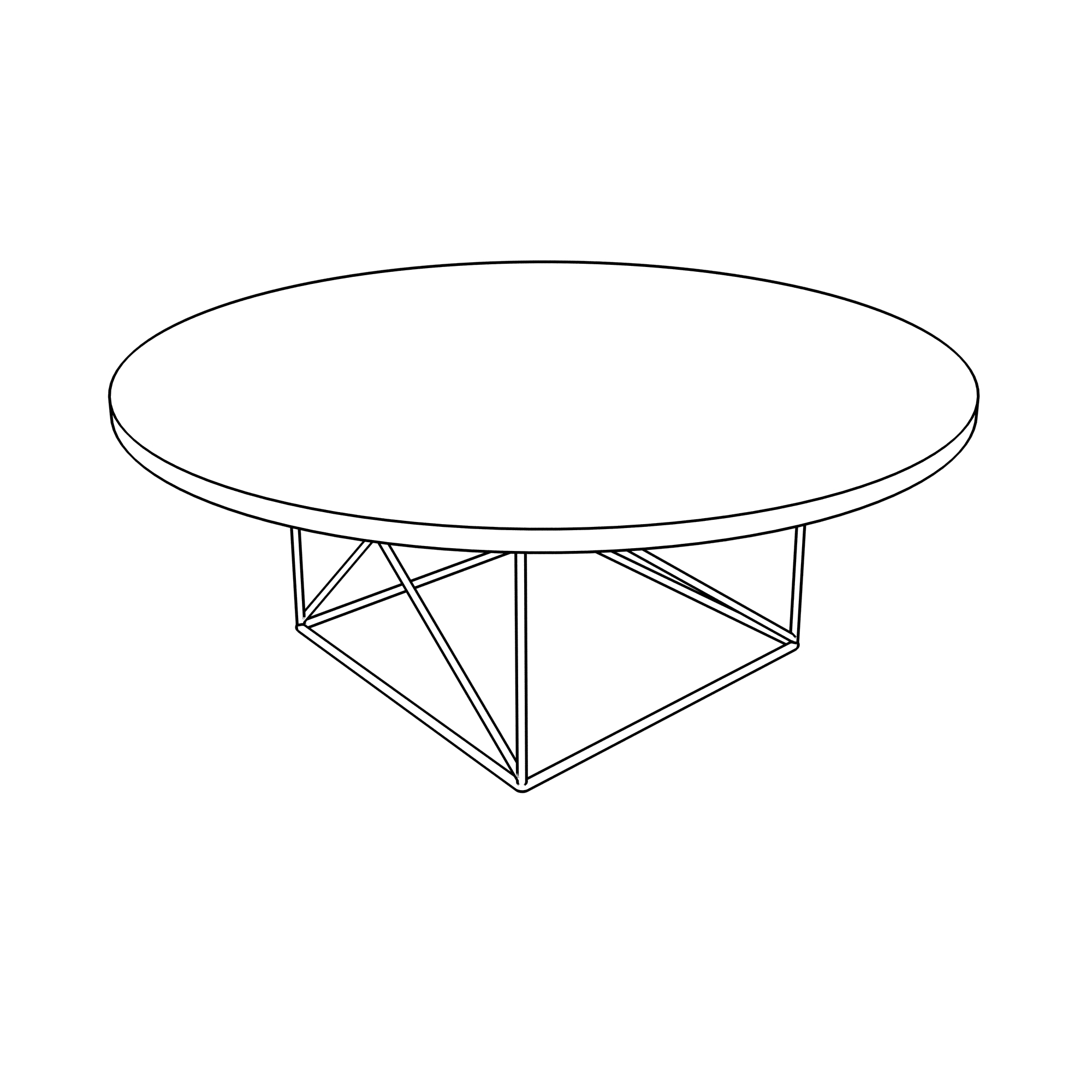 The LC15 collaborative table combines two simple geometric figures in an organic yet rational structure. The round top, more than 6 feet in diameter, is sturdy Natural Oak. The lattice base is a cube shape made of Black, Grey, or Green steel tubing that creates a different visual effect from various angles.