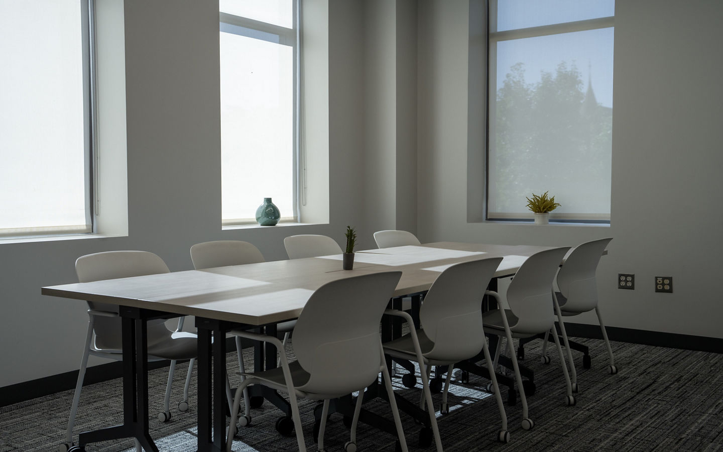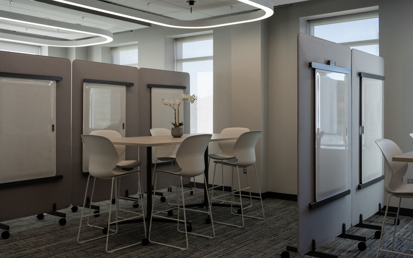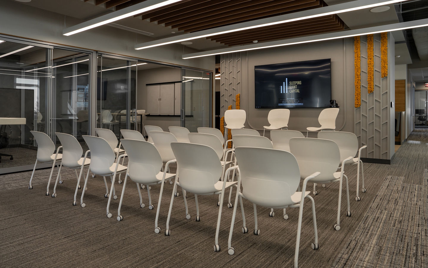 Sleeping Giant Capital’s downtown Kalamazoo office is a rare intersection: investment professionals executing confidential transactions, aspiring owner-operators searching for their next company, and undergraduate students working on growth strategy projects inside SGC’s portfolio. That mix creates competing needs. Their office balances privacy and discretion alongside openness, collaboration, and community relationship-building with business owners and local service providers.