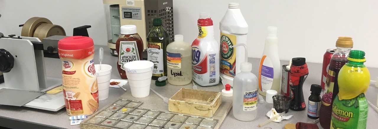 Haworth Test Lab Coordinator Christine Hicks oversees all the finish testing. Christine, who has worked in our lab for 18 of her 25 years with the company, is tasked with staining products with everything from markers to mustard. “The information we gather provides guidance for the care and maintenance instructions in manuals,” she says.