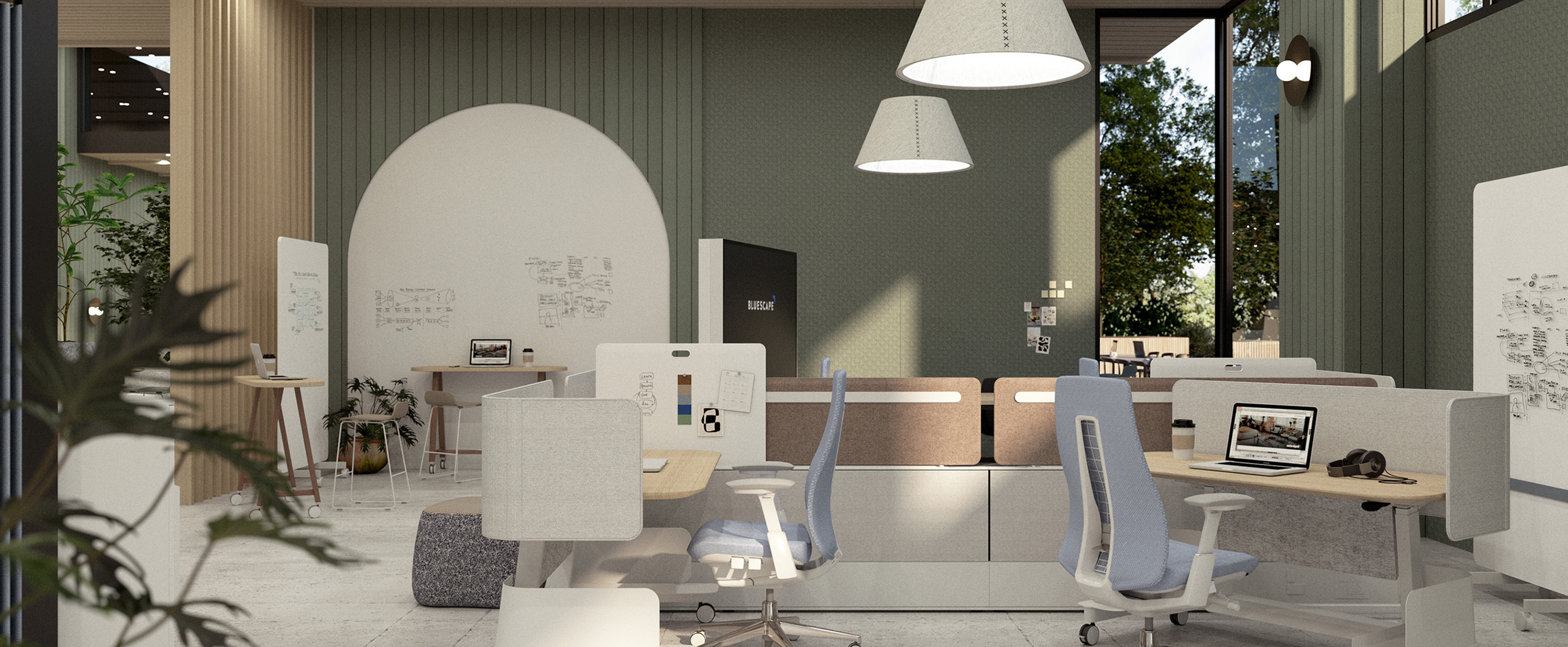- Lighting: Lighting is another crucial element of Physical Affordances. Proper lighting not only enables employees to see their work clearly but also impacts their mood, energy levels, and overall health. Natural light is particularly beneficial, as it has been shown to boost mood and productivity. However, not all workspaces have ample access to natural light. This makes the quality and placement of artificial lighting very important. The goal is to provide appropriate lighting for the tasks at hand—for example, bright and focused for detailed work, soft and warm lighting for relaxation areas.